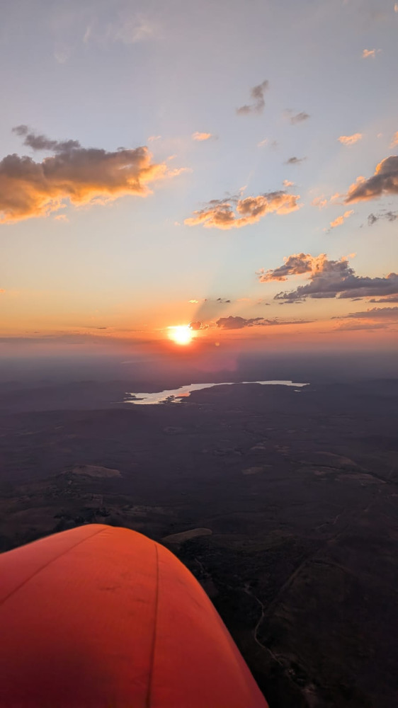Para mim, o mais bonito foi a última hora de voo no pôr do sol. As térmicas naquele dia tinham sido cansativas. Quase pousei várias vezes. Vi o sol se pondo e comecei a procurar um campo aberto para pousar, achando que o dia tinha acabado. Mas, para minha surpresa, encontrei uma térmica suave… depois mais uma… e outra… Os urubus me mostraram a última térmica do dia e eu entrei em um planeio final mágico, que me levou até o pouso dos meus companheiros de equipe — que estavam quilômetros à frente durante todo o dia. Foi indescritível.